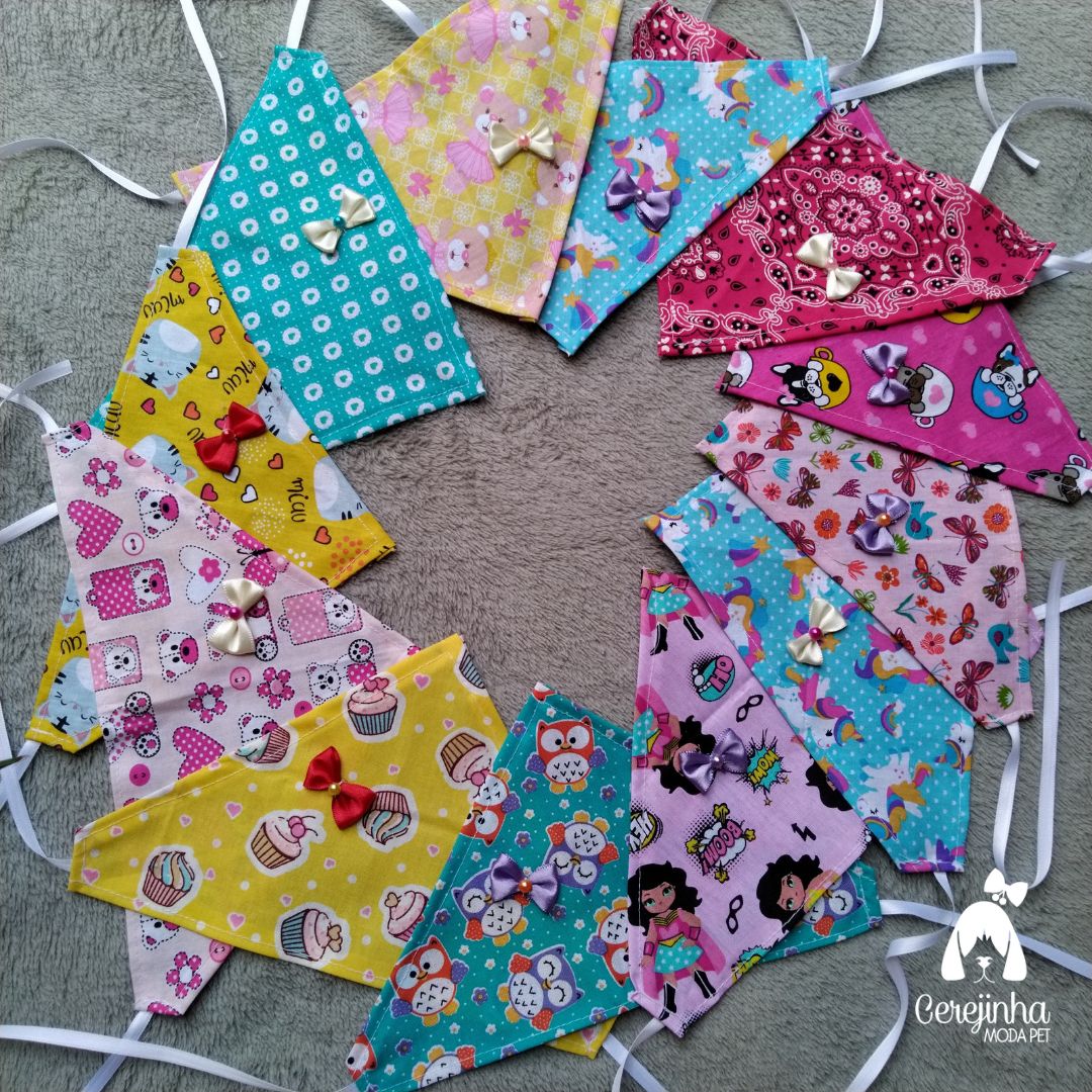 Todas as bandanas são confeccionas em tricoline, com costura, enfeite de lacinho, estampas sortidas para pet macho e fêmea.