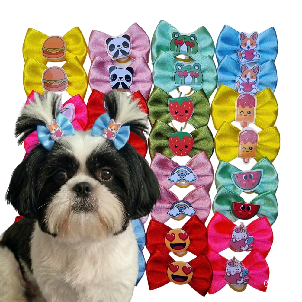 Laço pet com apliques e cores sortidos sem a opção de escolha. Amarração com elástico resistente.